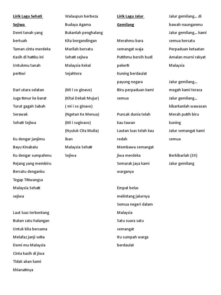 Lagu Patriotik Sehati Sejiwa Lirik Lagu Sehati Sejiwa Sama Seperti Tahun Lepas Cuma Logo Ada Tukar Lah Qiqi Juned